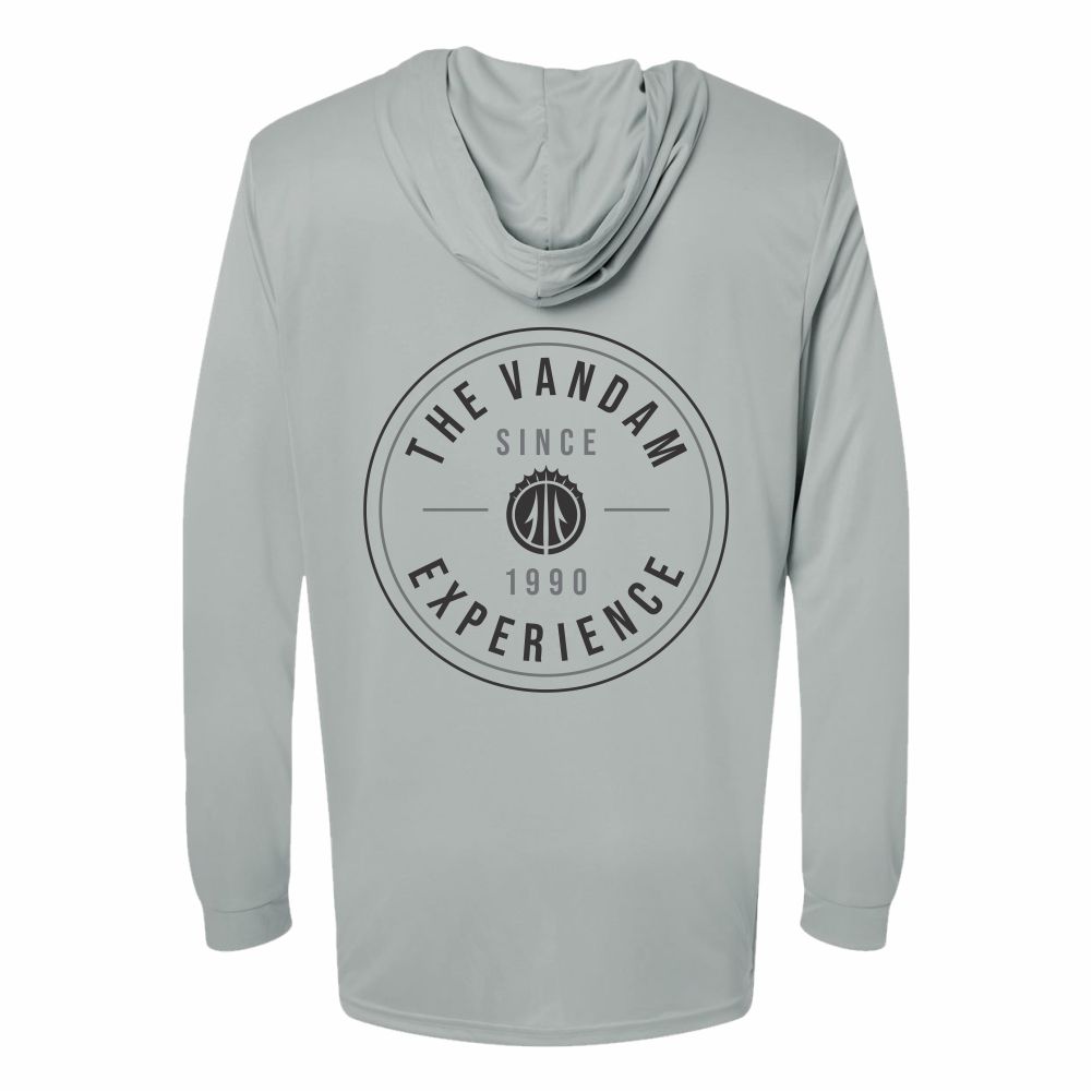 Performance fabric hooded long sleeve, breathable fishing shirt. Built to fish all day and keep wearing all night. Custom “THE VANDAM EXPERIENCE” television show graphic on back, KVD trident on front.
